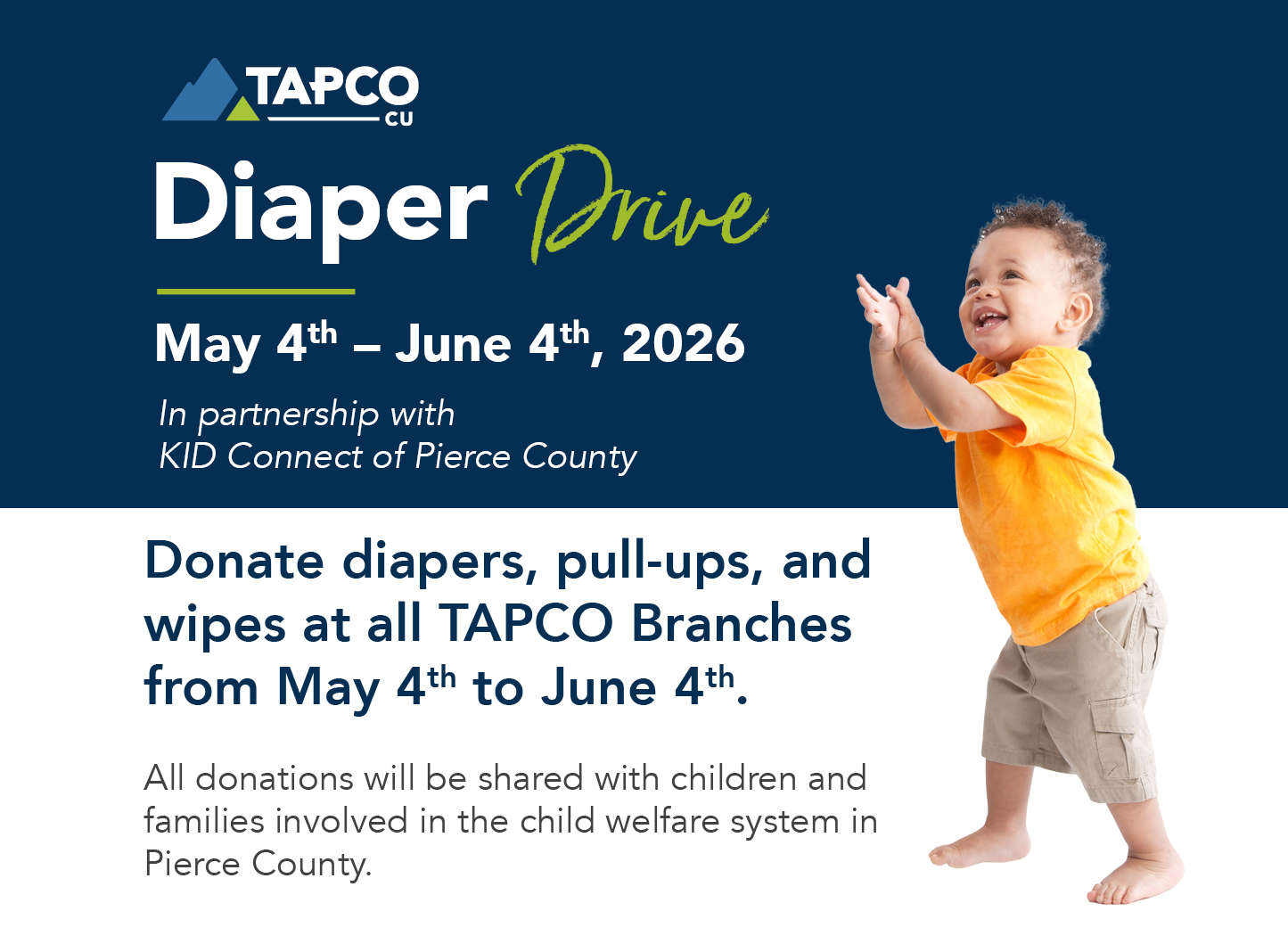 Stop by any TAPCO branch to donate diapers, pull-ups, or baby wipes and help support children and families involved in the child welfare system right here in Pierce County.