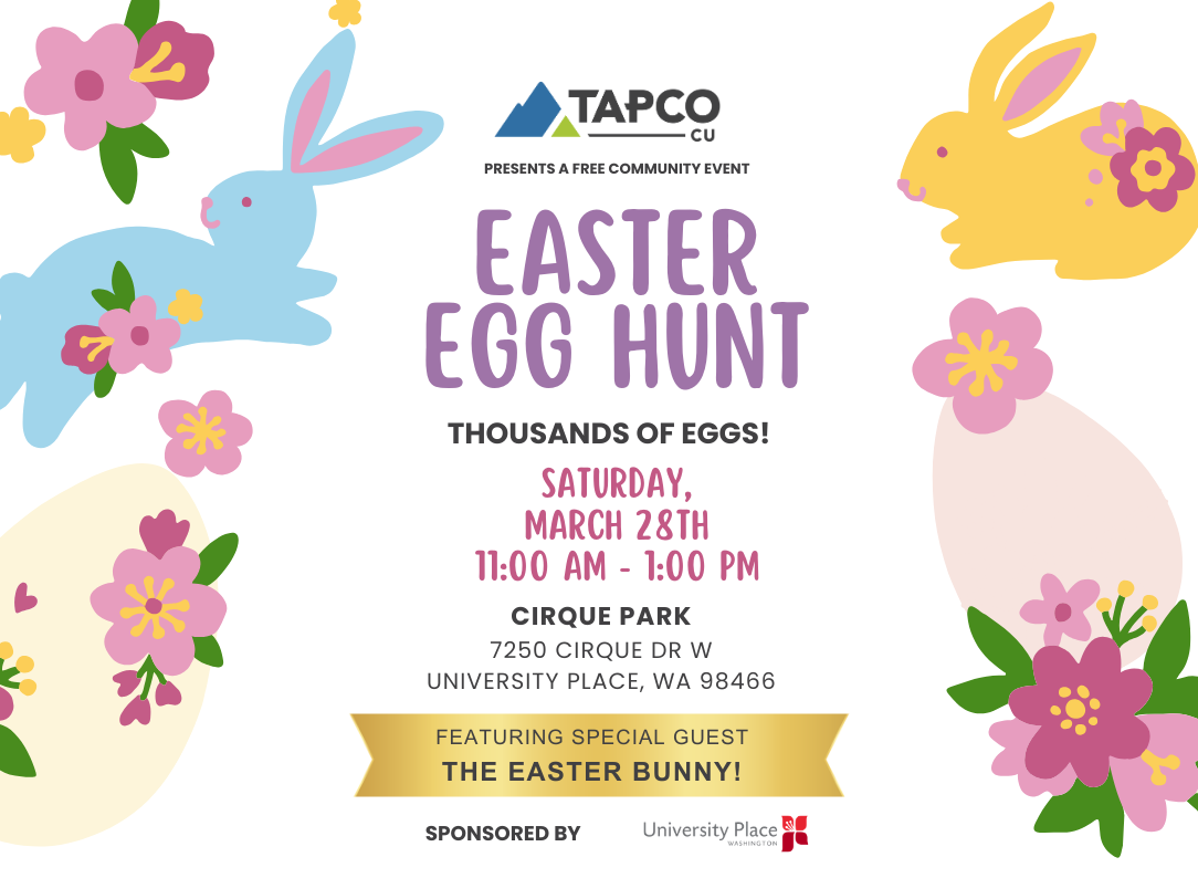 Join TAPCO Credit Union for a free Easter Egg Hunt on March 28th at Cirque Park in University Place. Thousands of eggs, free Easter Bunny photos, and family fun for all ages.